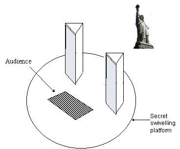 1. David Copperfield mempunayi alat yang super canggih dengan tempat duduk penonton yang bisa berputar-putar. Pertama David Copperfield mengeset semua alatnya dalam kondisi seperti gambar diatas, sehingga pandangan penonton tertuju pada patung Liberty saja.